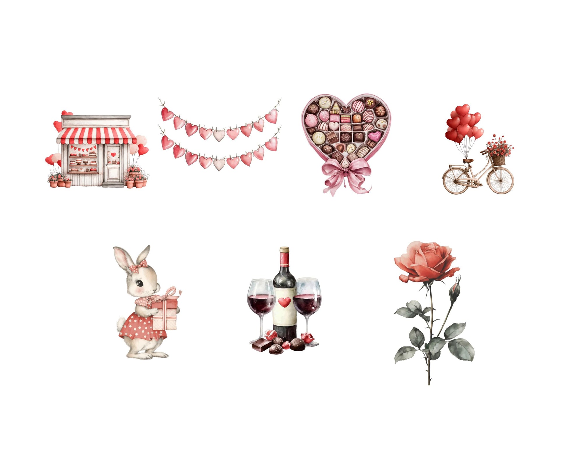 This set of 80 high-quality Cute Valentine clipart illustrations is ideal for infusing creativity and charm into any project. Showcasing high-resolution graphics with transparent backgrounds, these whimsical images are perfect for a variety of uses, from children's party invitations to nursery decorations, scrapbooking, and beyond. Whether you’re designing personalized gifts, digital planners, or social media graphics, these charming and adaptable clipart illustrations are guaranteed to elevate your work and bring a delightful flair to every project.
