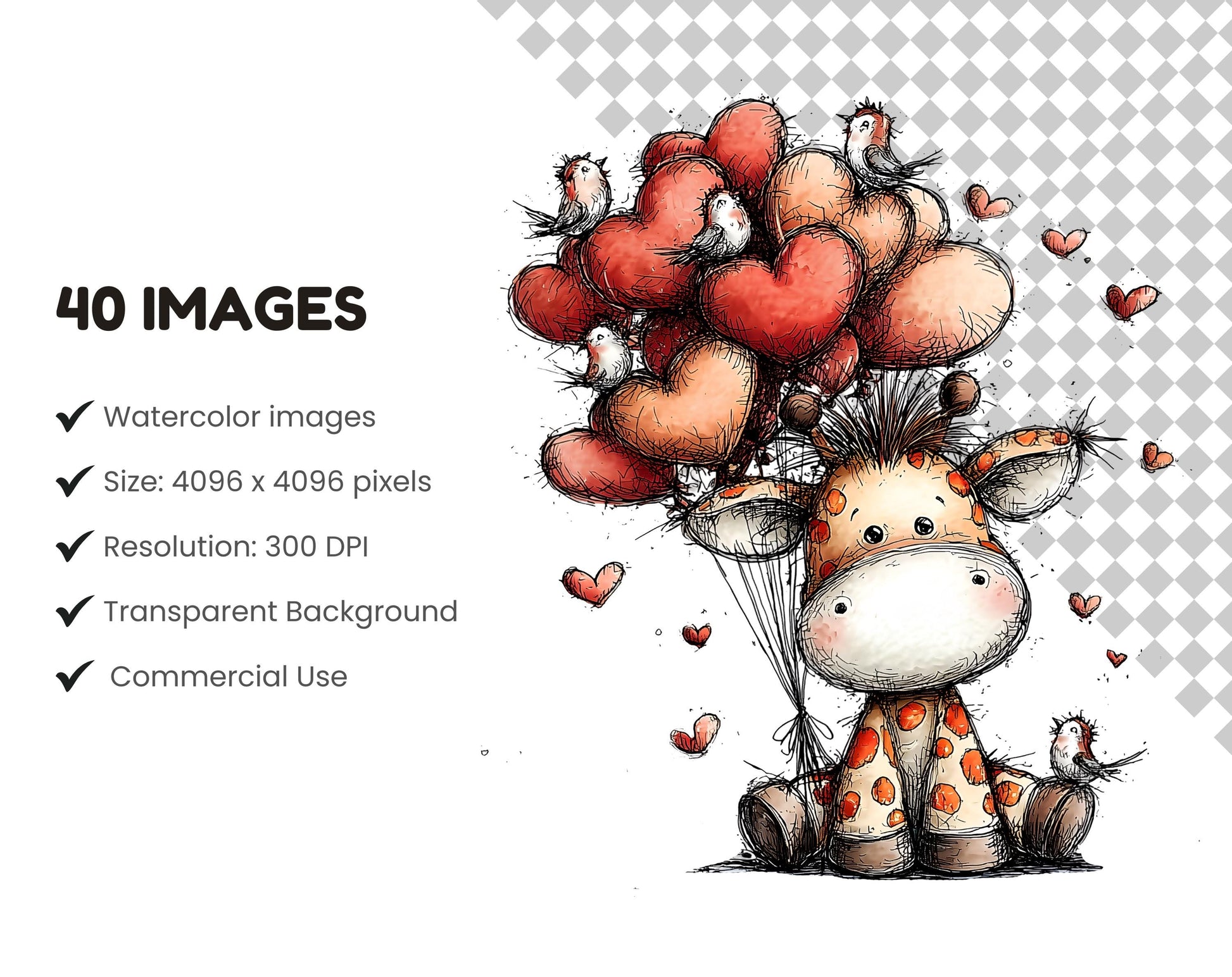 This set of 40 high-quality Valentine Animals clipart illustrations is ideal for infusing creativity and charm into any project. Showcasing high-resolution graphics with transparent backgrounds, these whimsical images are perfect for a variety of uses, from children's party invitations to nursery decorations, scrapbooking, and beyond. Whether you’re designing personalized gifts, digital planners, or social media graphics, these charming and adaptable clipart illustrations are guaranteed to elevate your work and bring a delightful flair to every project.