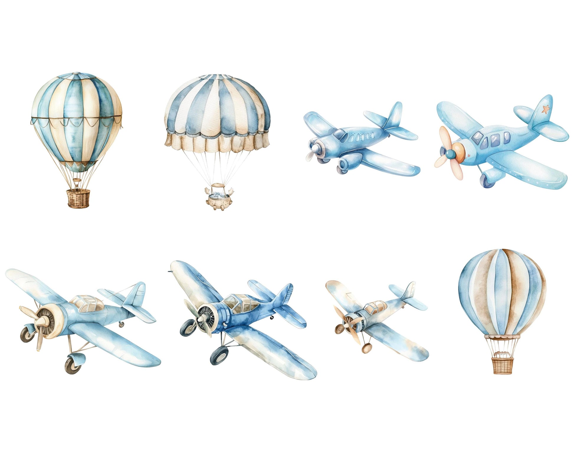 Watercolor Air Transport Clipart Bundle, Airplane, Balloons (Instant Download)