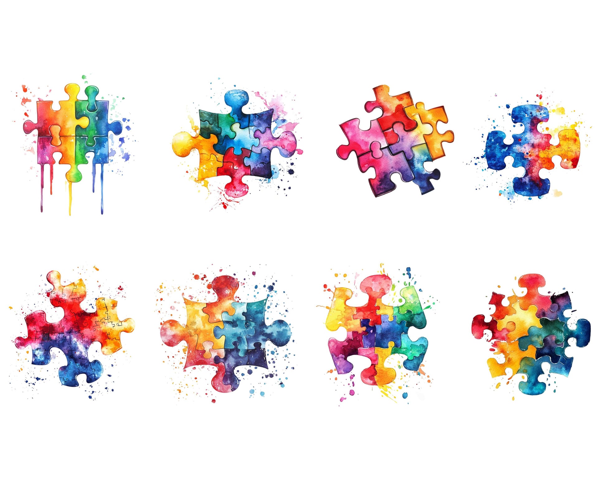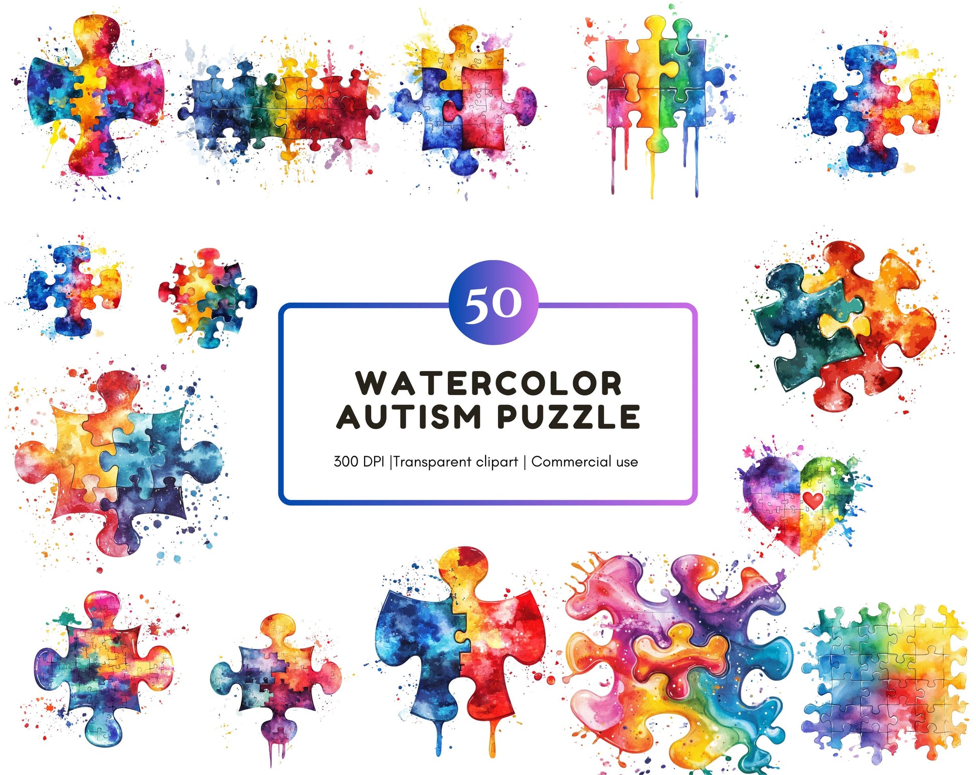 Watercolor Autism Awareness Clipart Bundle, Colorful Puzzle Piece Autism Awareness png, Autism Puzzle Heart Clipart, Autism Awareness Bundle