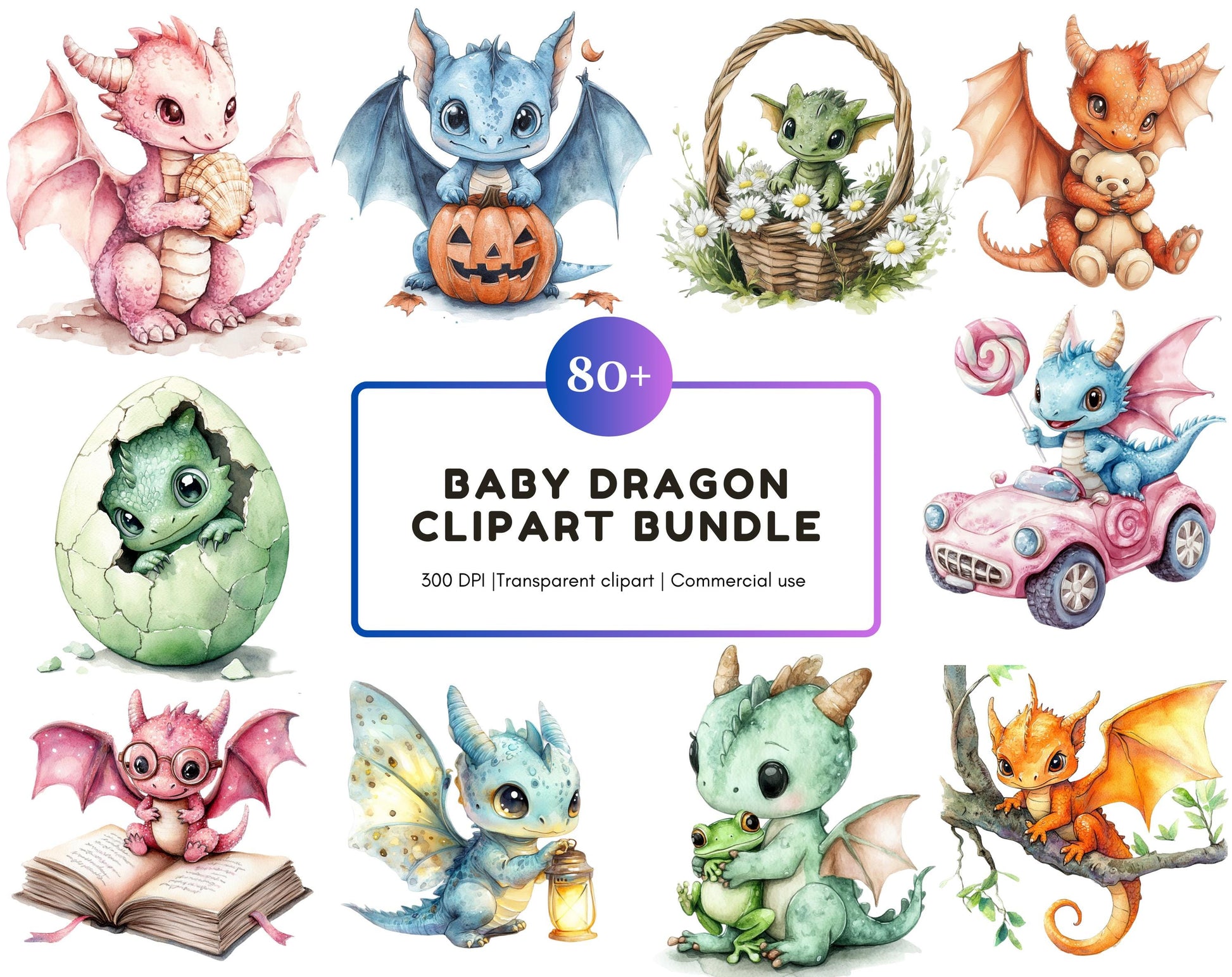 Watercolor Baby Dragon Clipart Bundle, Fairytale Graphics (Digital Download)