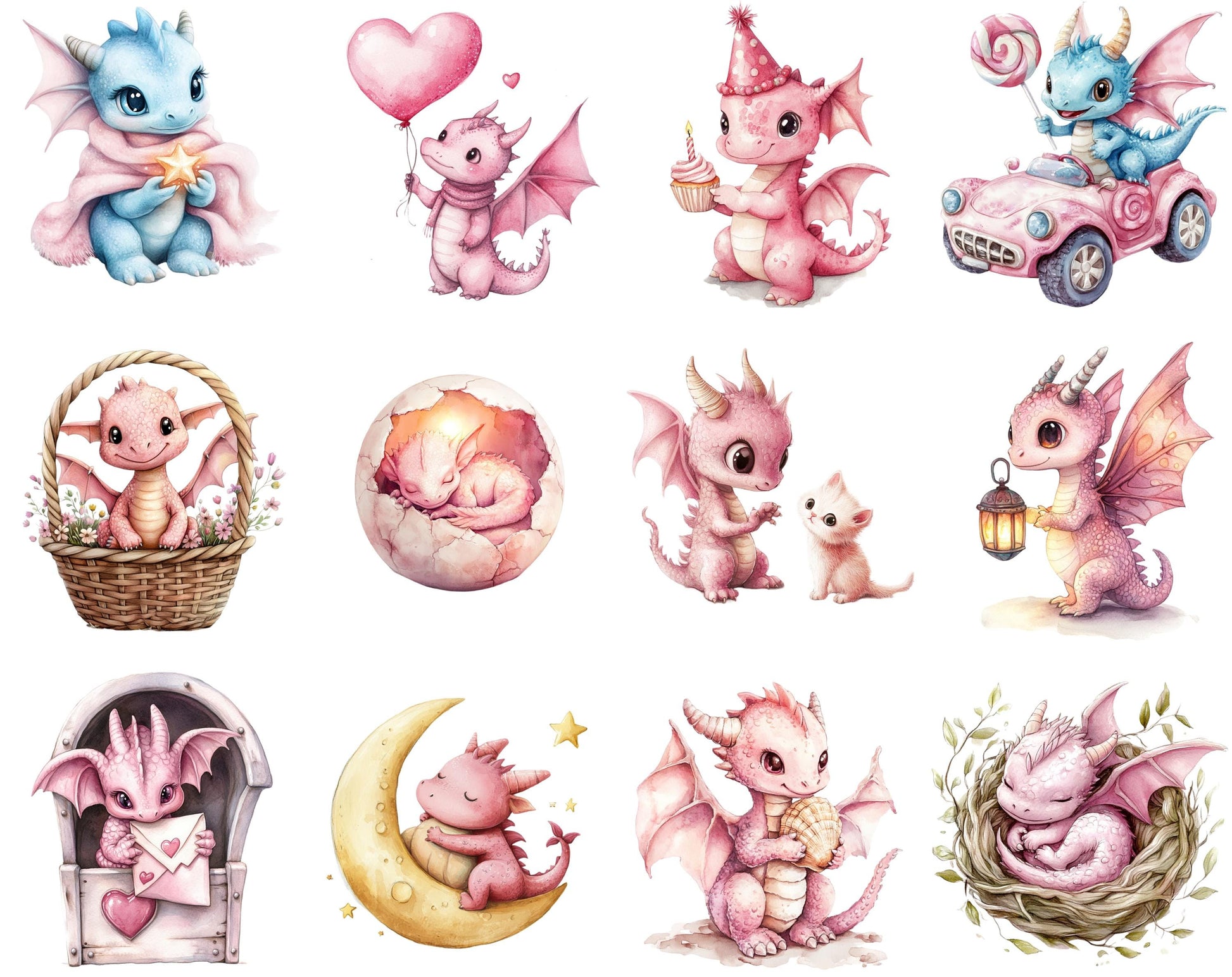This set of 100 high-quality Baby Dragon clipart illustrations is ideal for infusing creativity and charm into any project. Showcasing high-resolution graphics with transparent backgrounds, these whimsical images are perfect for a variety of uses, from children's party invitations to nursery decorations, scrapbooking, and beyond. Whether you’re designing personalized gifts, digital planners, or social media graphics, these charming and adaptable clipart illustrations are guaranteed to elevate your work and bring a delightful flair to every project.