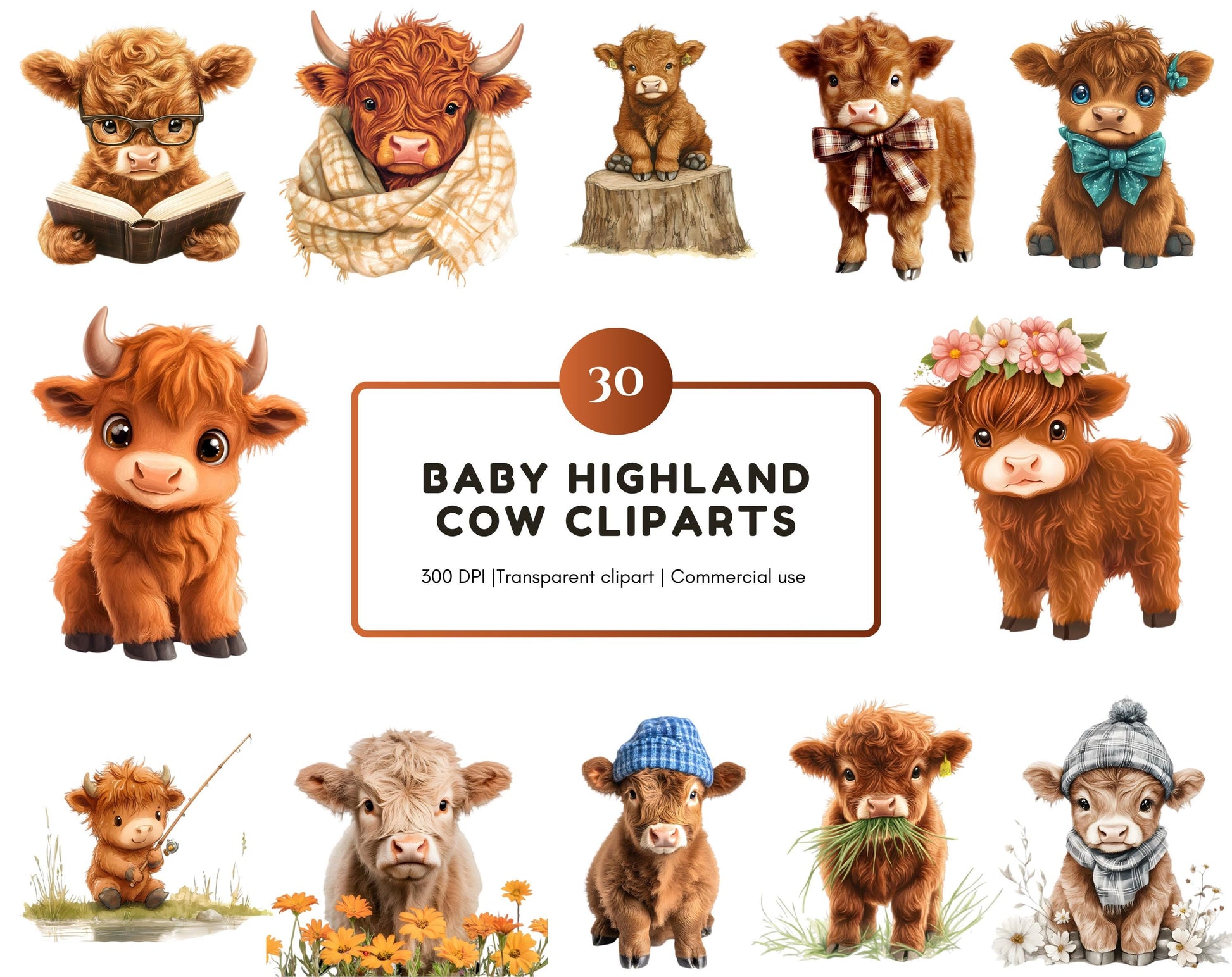 1) 30 high-quality Baby Highland Cow clipart image files featuring transparent backgrounds