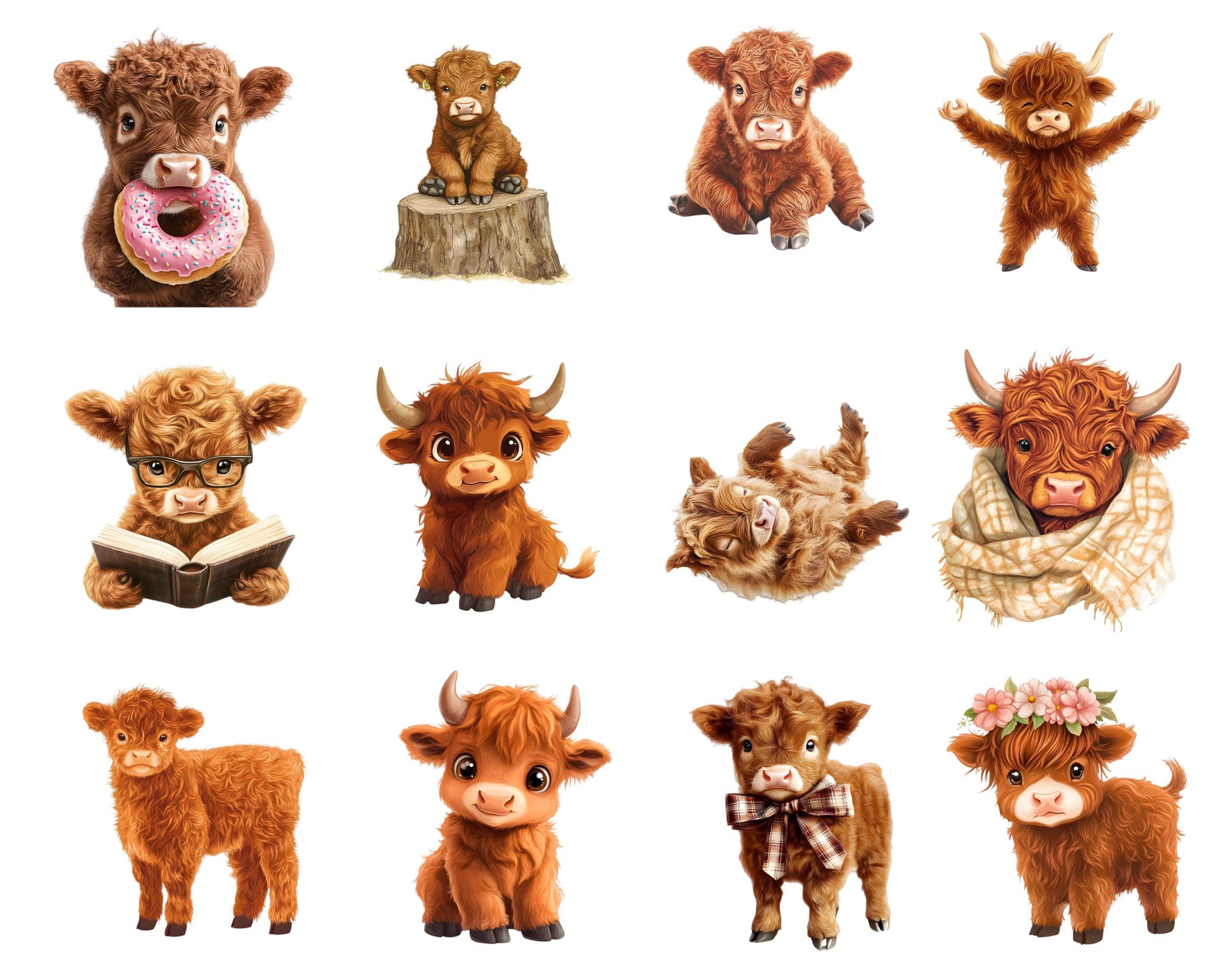 This set of 30 high-quality Baby Highland Cow clipart illustrations is ideal for infusing creativity and charm into any project. Showcasing high-resolution graphics with transparent backgrounds, these whimsical images are perfect for a variety of uses, from children's party invitations to nursery decorations, scrapbooking, and beyond. Whether you’re designing personalized gifts, digital planners, or social media graphics, these charming and adaptable clipart illustrations are guaranteed to elevate your work and bring a delightful flair to every project.