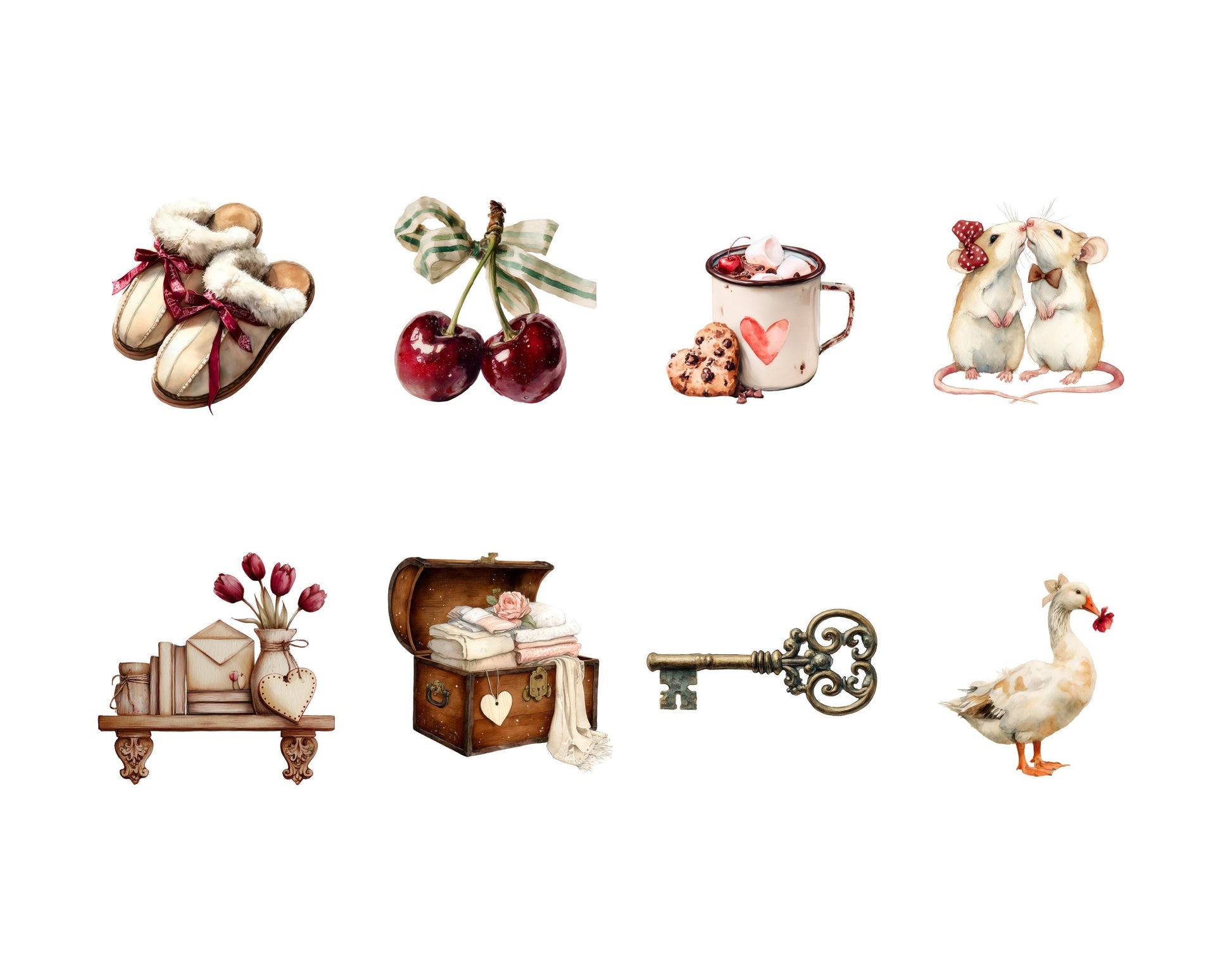 This set of 86 high-quality Cherry In Love Valentine's Day clipart illustrations is ideal for infusing creativity and charm into any project. Showcasing high-resolution graphics with transparent backgrounds, these whimsical images are perfect for a variety of uses, from children's party invitations to nursery decorations, scrapbooking, and beyond. Whether you’re designing personalized gifts, digital planners, or social media graphics, these charming and adaptable clipart illustrations are guaranteed to elevate your work and bring a delightful flair to every project.