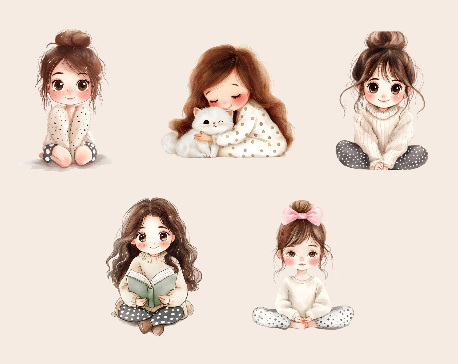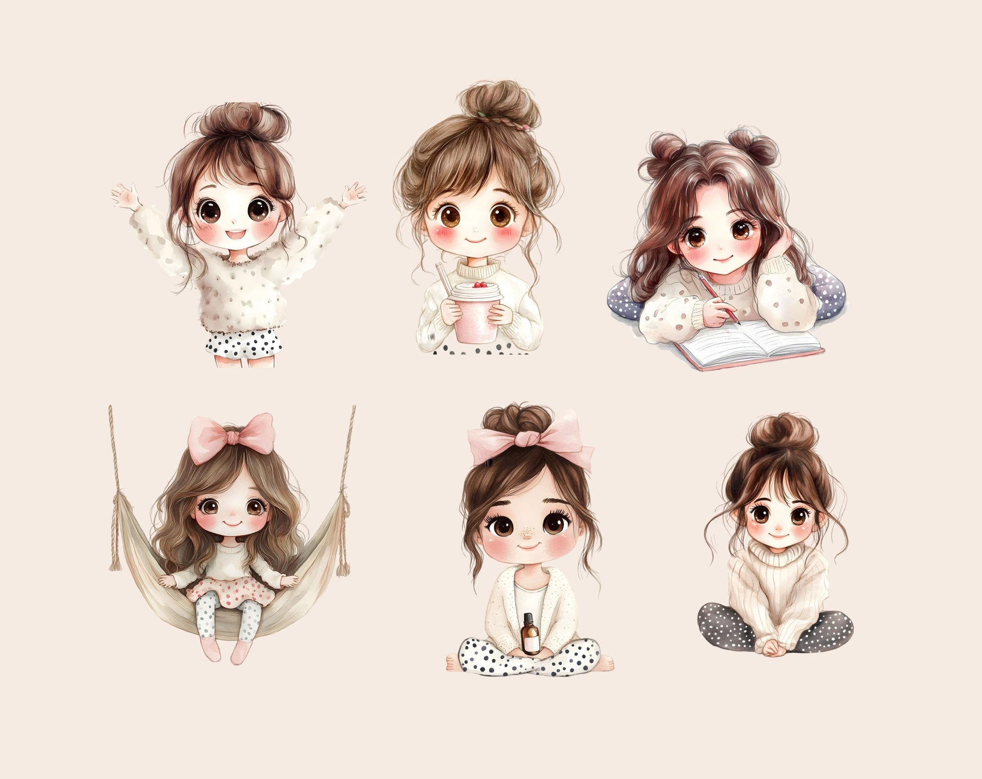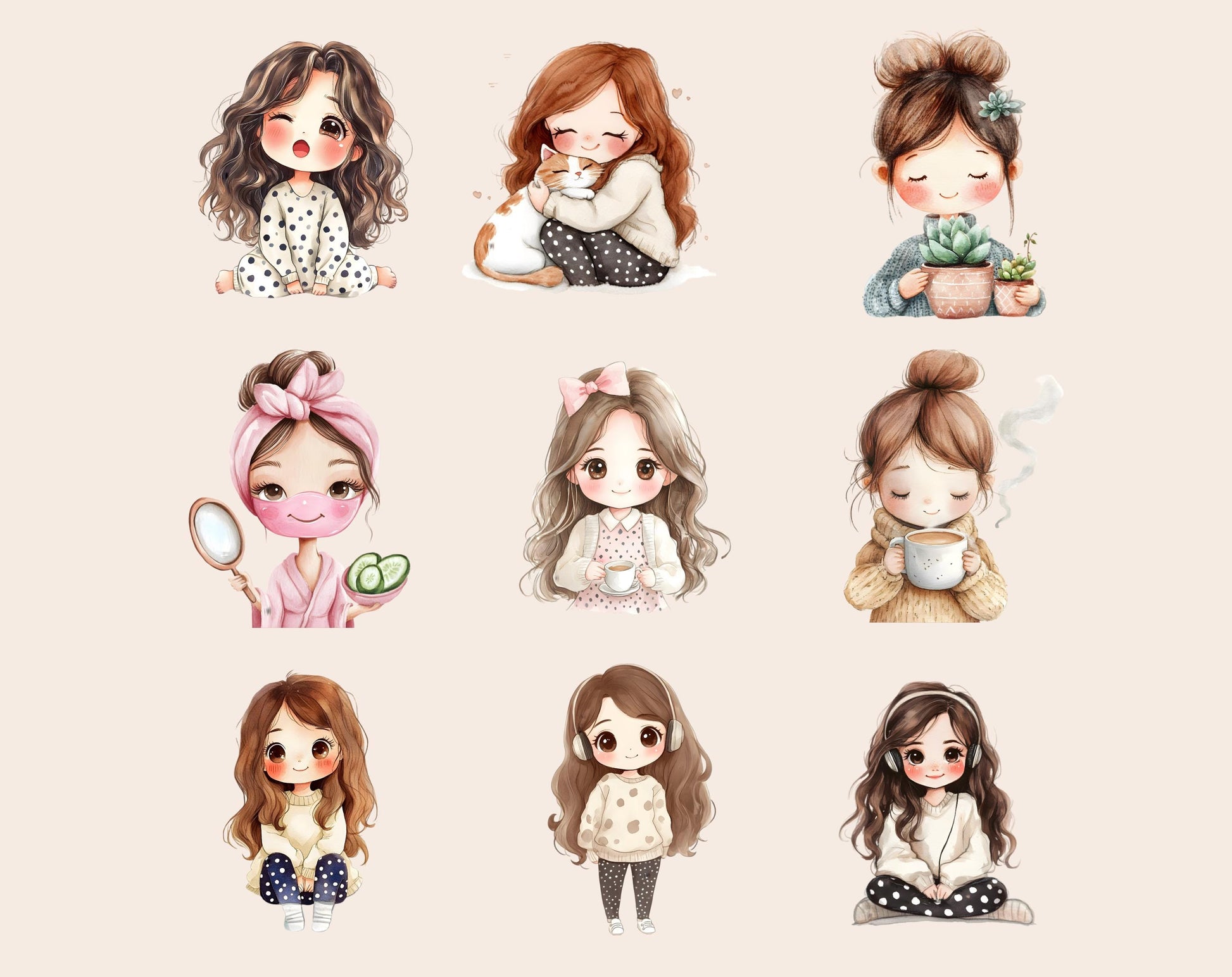 This set of 60 high-quality Cozy Self Care clipart illustrations is ideal for infusing creativity and charm into any project. Showcasing high-resolution graphics with transparent backgrounds, these whimsical images are perfect for a variety of uses, from children's party invitations to nursery decorations, scrapbooking, and beyond. Whether you’re designing personalized gifts, digital planners, or social media graphics, these charming and adaptable clipart illustrations are guaranteed to elevate your work and bring a delightful flair to every project.