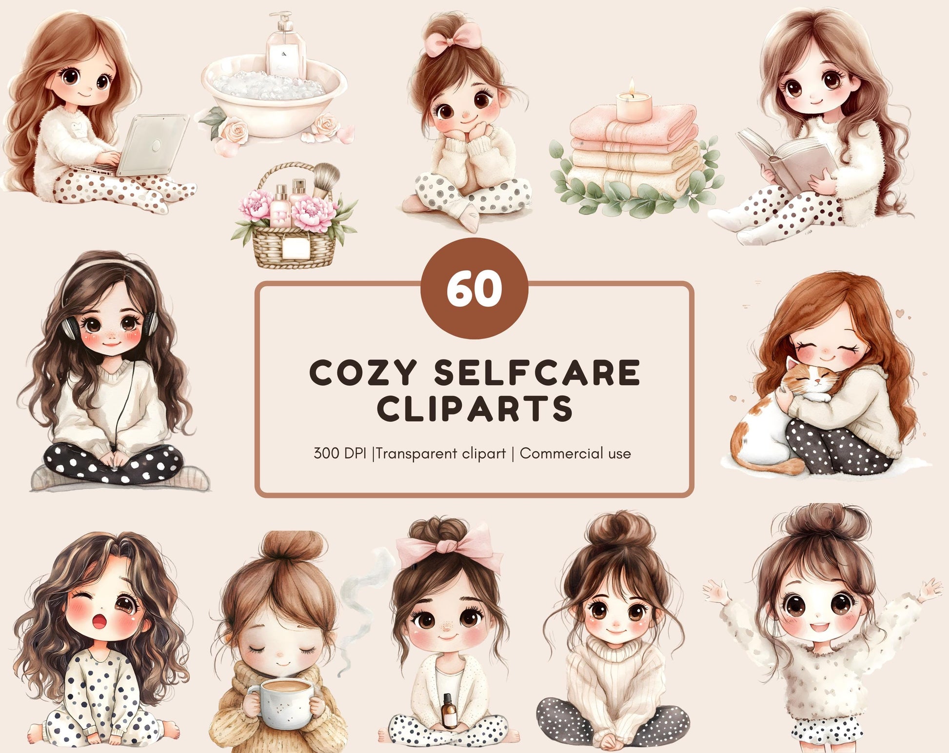 1) 60 high-quality Cozy Self Care clipart image files featuring transparent backgrounds