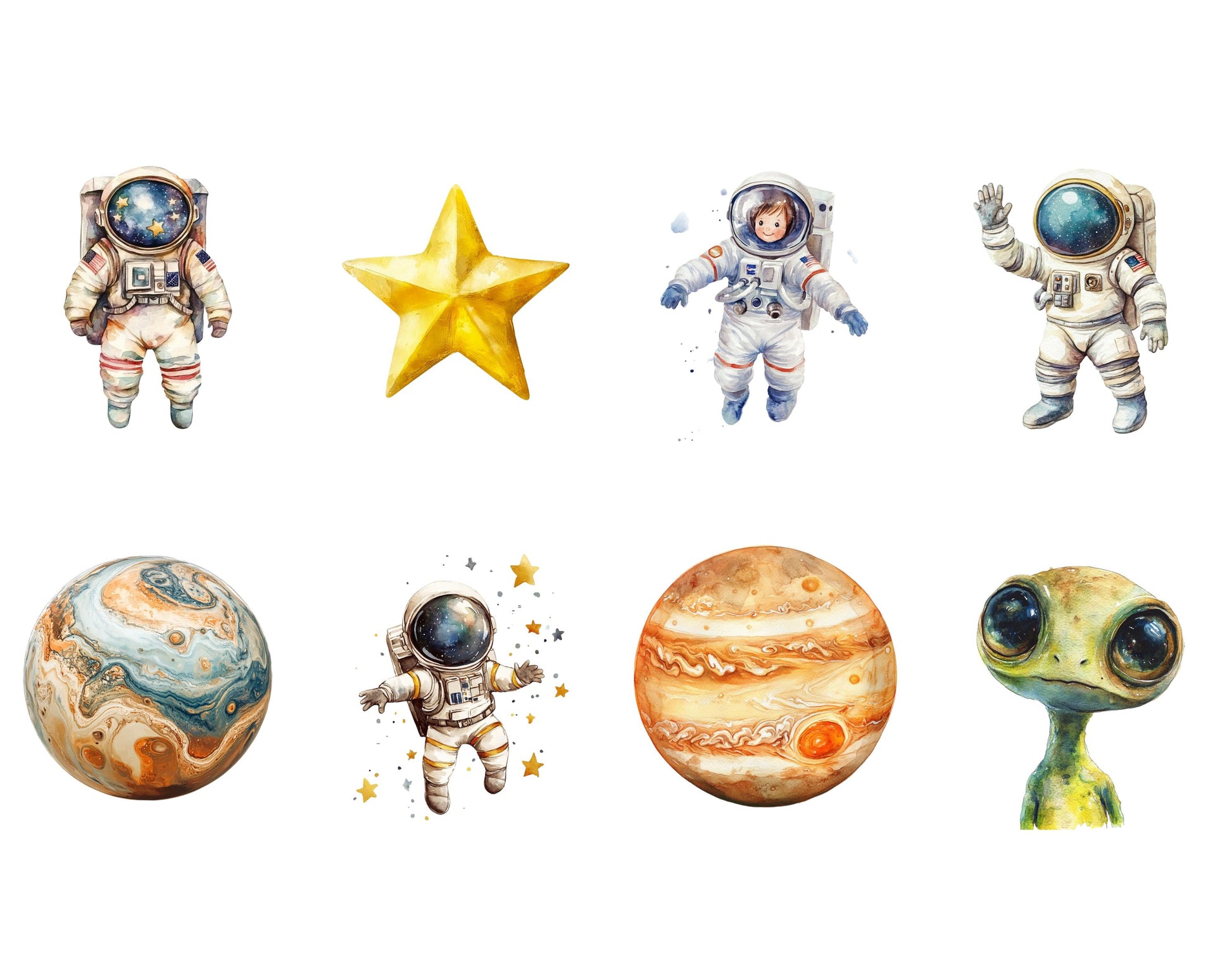 This set of 75 high-quality Space clipart illustrations is ideal for infusing creativity and charm into any project. Showcasing high-resolution graphics with transparent backgrounds, these whimsical images are perfect for a variety of uses, from children's party invitations to nursery decorations, scrapbooking, and beyond. Whether you’re designing personalized gifts, digital planners, or social media graphics, these charming and adaptable clipart illustrations are guaranteed to elevate your work and bring a delightful flair to every project.