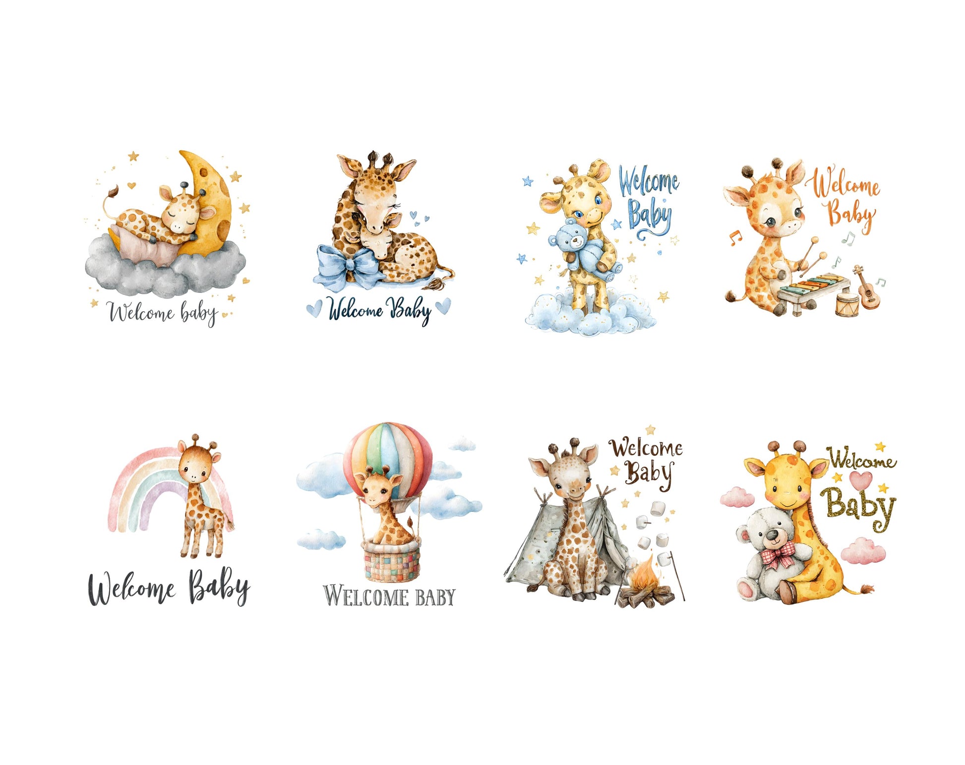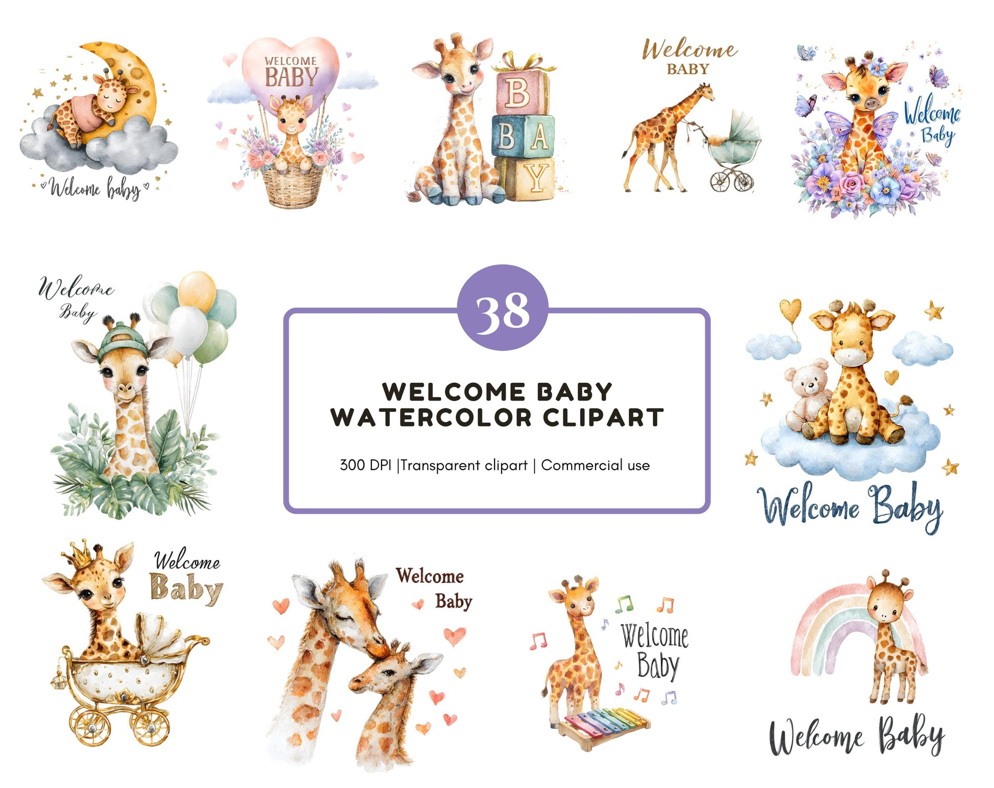 Watercolor Welcome Baby Clipart Bundle png, Cute Giraffe Clipart, Baby Giraffe Clipart png, Baby Shower, Nursery Decor Welcome Baby Clipart