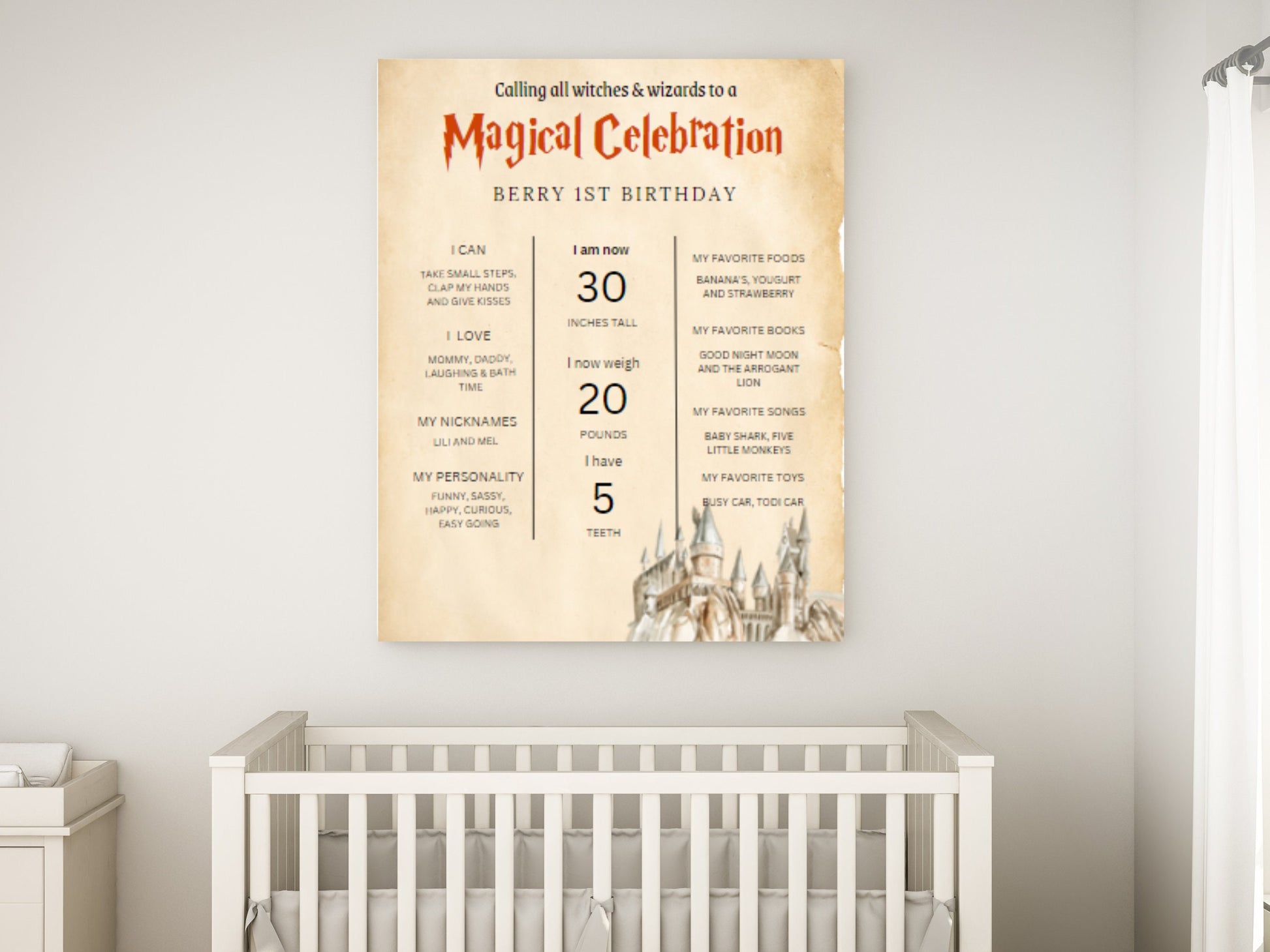 Wizard 1st Birthday Milestone Board, Editable Photo Sign (Printable Template)